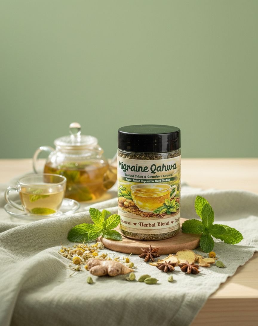 Migraine Qahwa is a carefully crafted herbal blend designed to support calmness, relaxation, and head comfort.